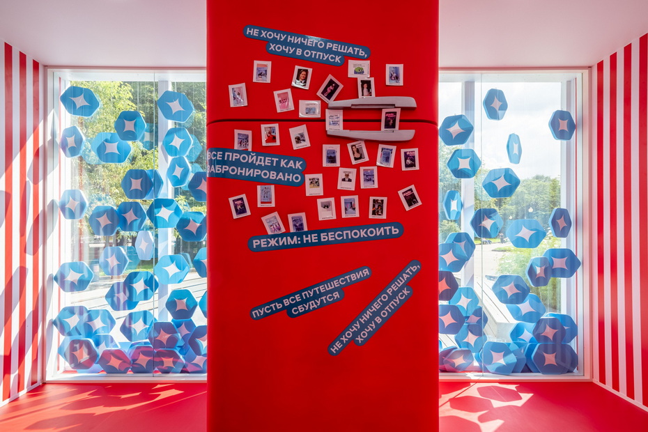 Интерактивная зона находится в центральной части Парка Горького справа от главного фонтана. В центре инсталляции — павильон с несколькими комнатами, каждая из которых посвящена определенному этапу путешествия: от выбора жилья и заселения до отдыха и возвращения домой. Площадка насыщена арт-объектами для эффектных фото в социальных сетях: огромный прозрачный чемодан на входе с призывом «Не забудь себя в отпуск», комната в неоновом оформлении с плюшевой обстановкой, большое количество зеркал, зона с перевернутым бассейном.