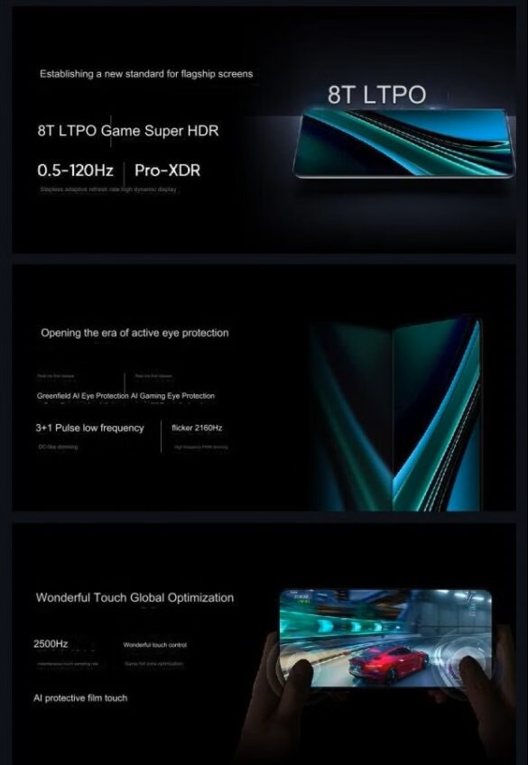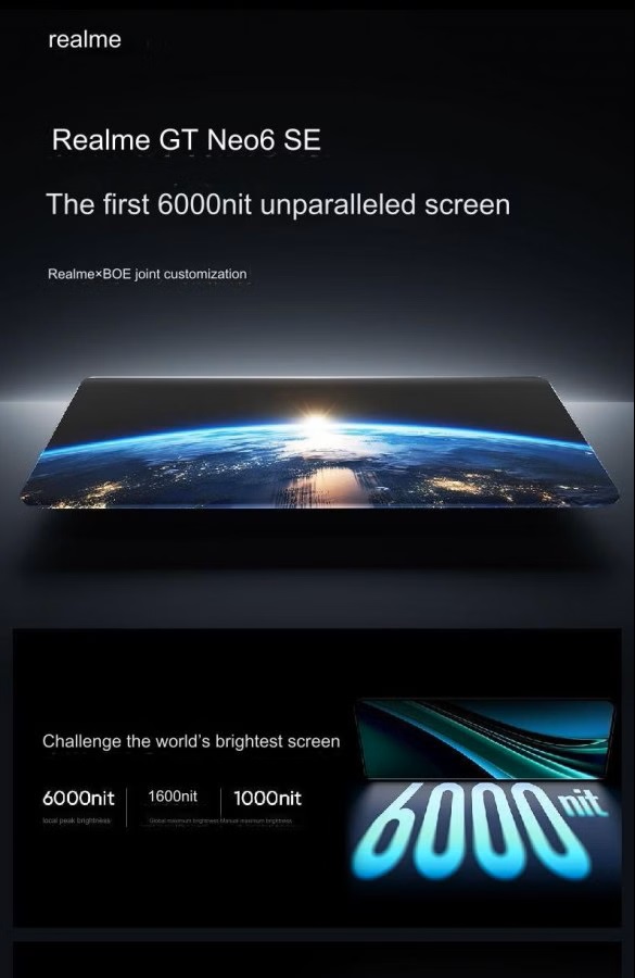 Помимо реального фото, компания Realme поделилась некоторыми характеристиками экрана GT Neo6 SE. Он будет изготовлен компанией BOE по технологии 8T LTPO OLED. Разрешение дисплея составит 1.5K, частота обновления будет варьироваться от 0.5 до 120 Гц, а пиковая яркость достигнет невероятных 6000 нит.